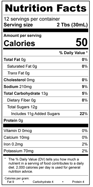 INGREDIENTS:  Sugar, Water, Tomato Paste, Brown Sugar (Cane Sugar and Molasses), Distilled Vinegar, Rice Wine Vinegar, Honey, Datil Peppers, Salt, Onion Powder, Xanthan Gum, Garlic Powder.
