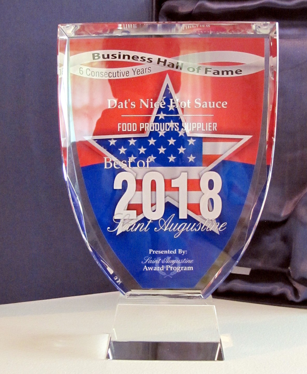 SAINT AUGUSTINE April 23, 2018 — Dat’s Nice Hot Sauce has been selected for the 2018 Best of Saint Augustine Award in the Food Products Supplier category by the Saint Augustine Award Program.